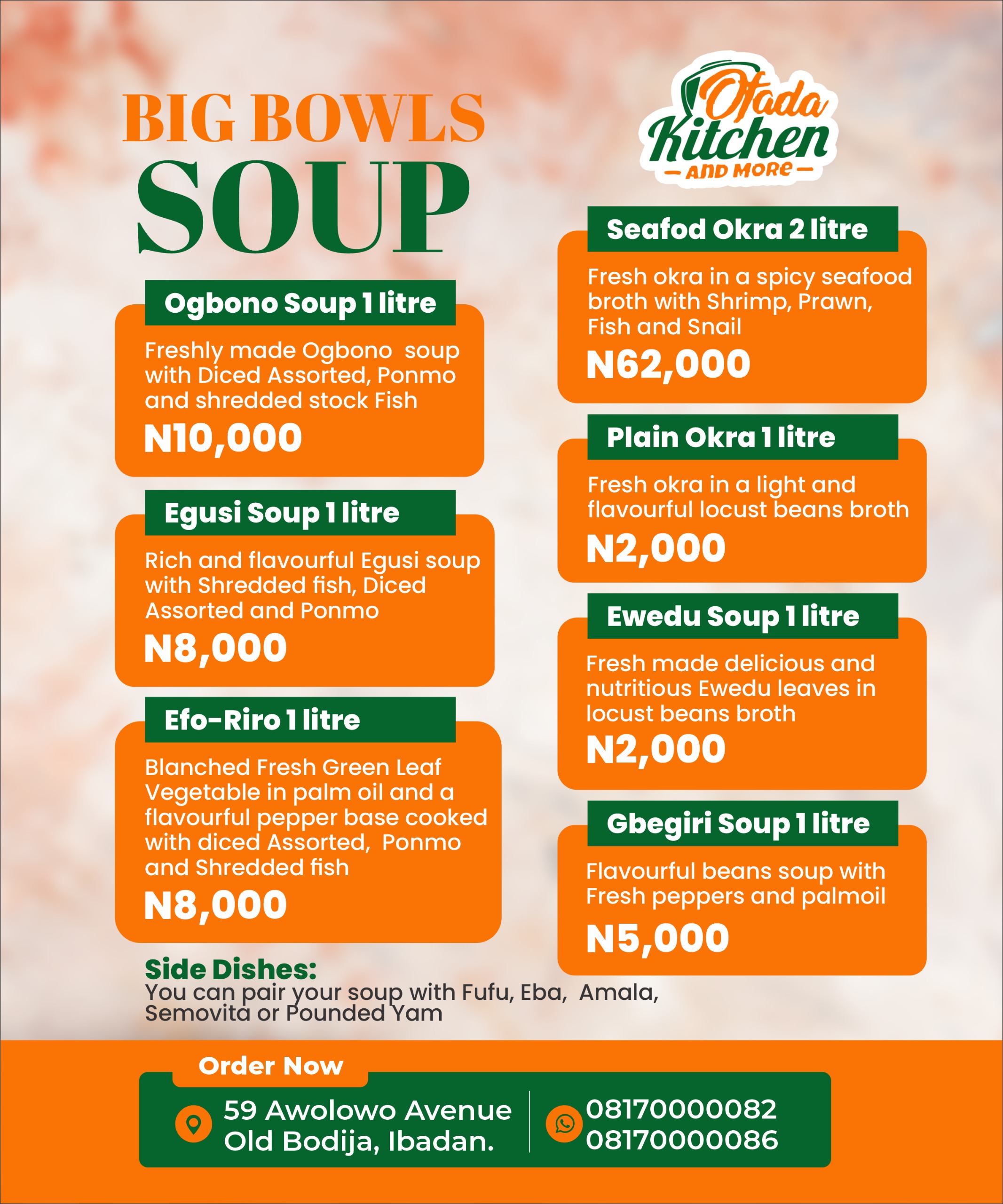 Since 2008, Ofada Kitchen has served authentic Nigerian flavours with the highest standards of hygiene and professionalism. From our signature Ofada dishes to wholesome meals for families and busy professionals, we deliver quality you can taste; fresh, nourishing, and always satisfying.